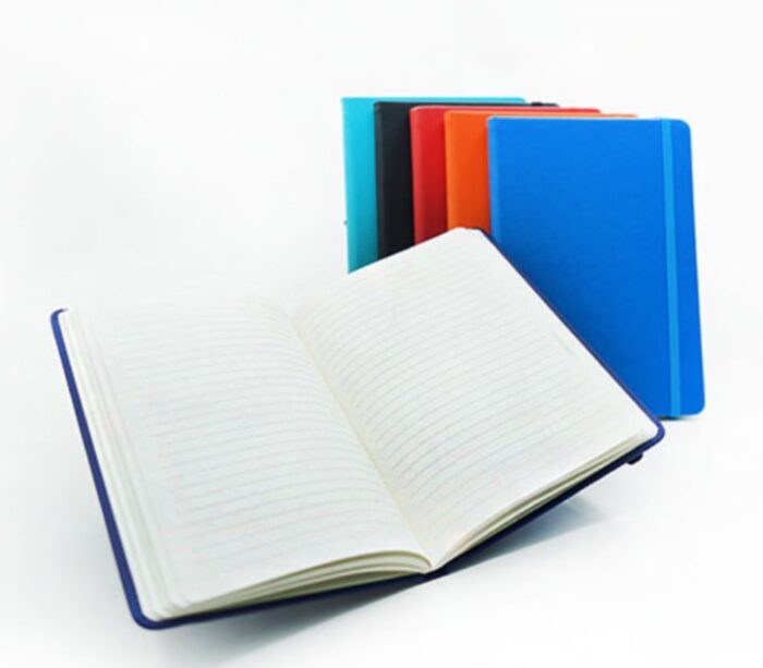 A notebook featuring a classic, sleek spine that creates a clean and professional edge. This binding allows it to lie flat when open, providing a seamless writing surface that’s perfect for capturing ideas, making it an ideal choice for custom corporate gifts, branded merchandise, and academic use in schools and universities.